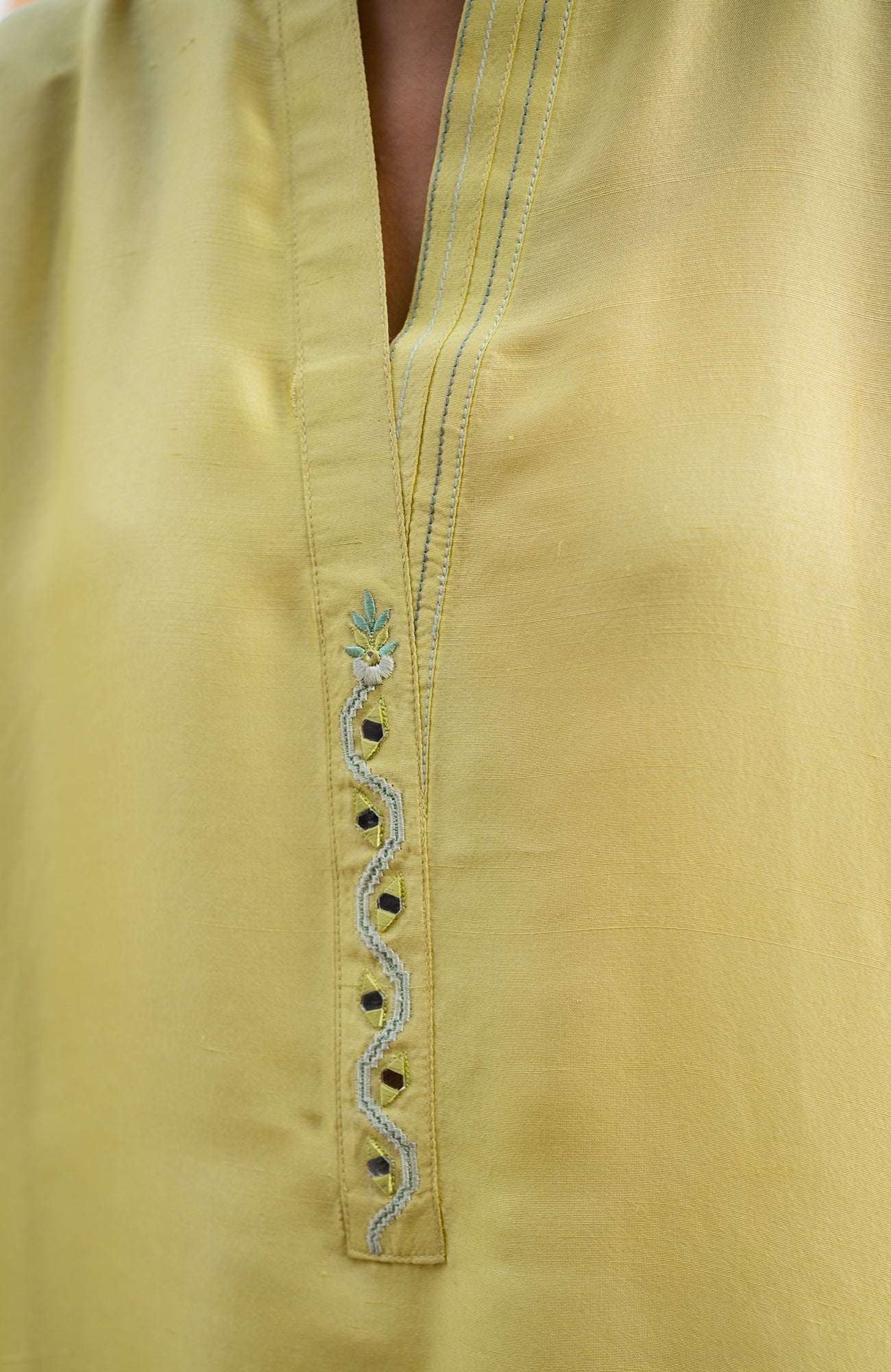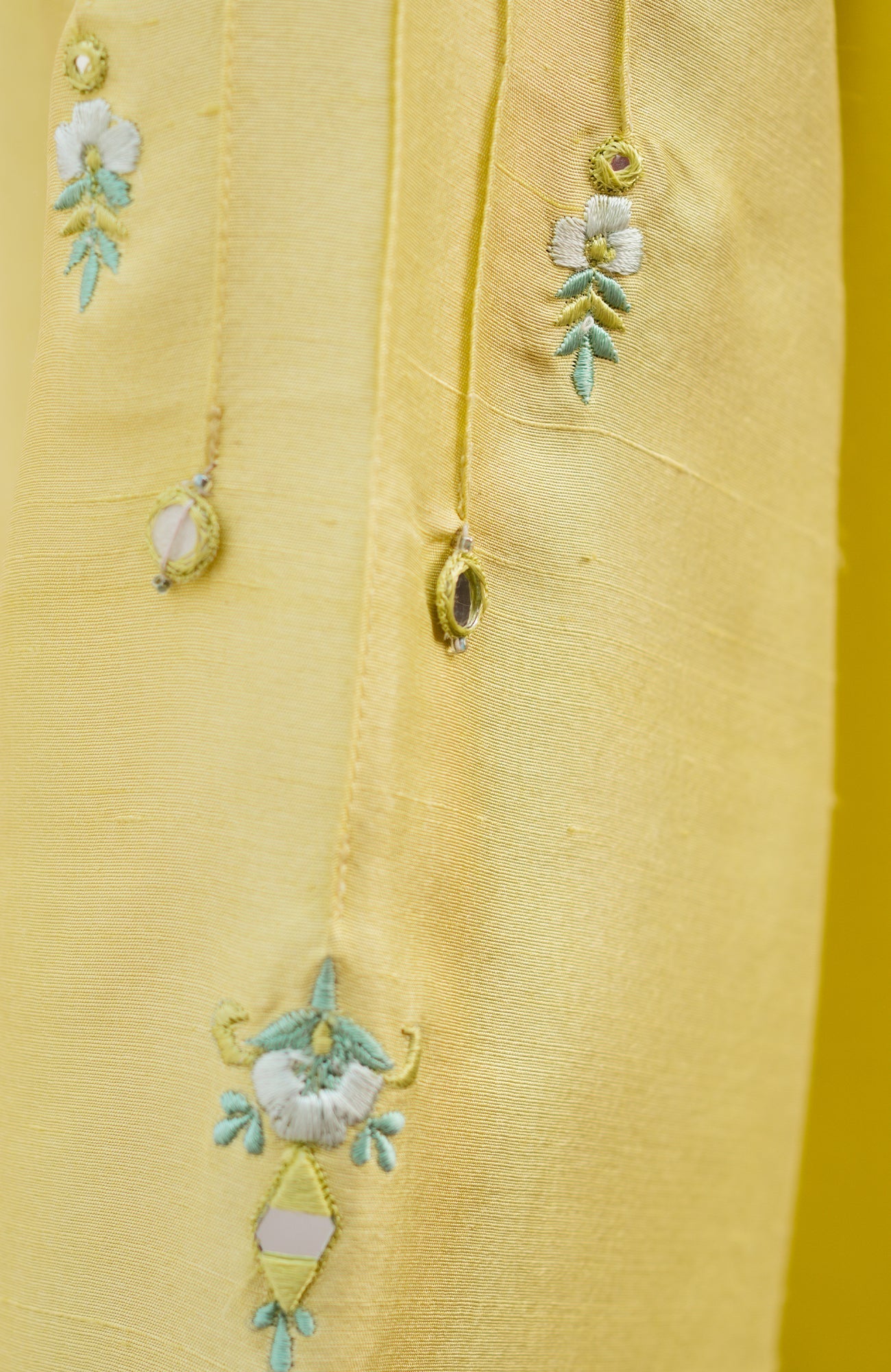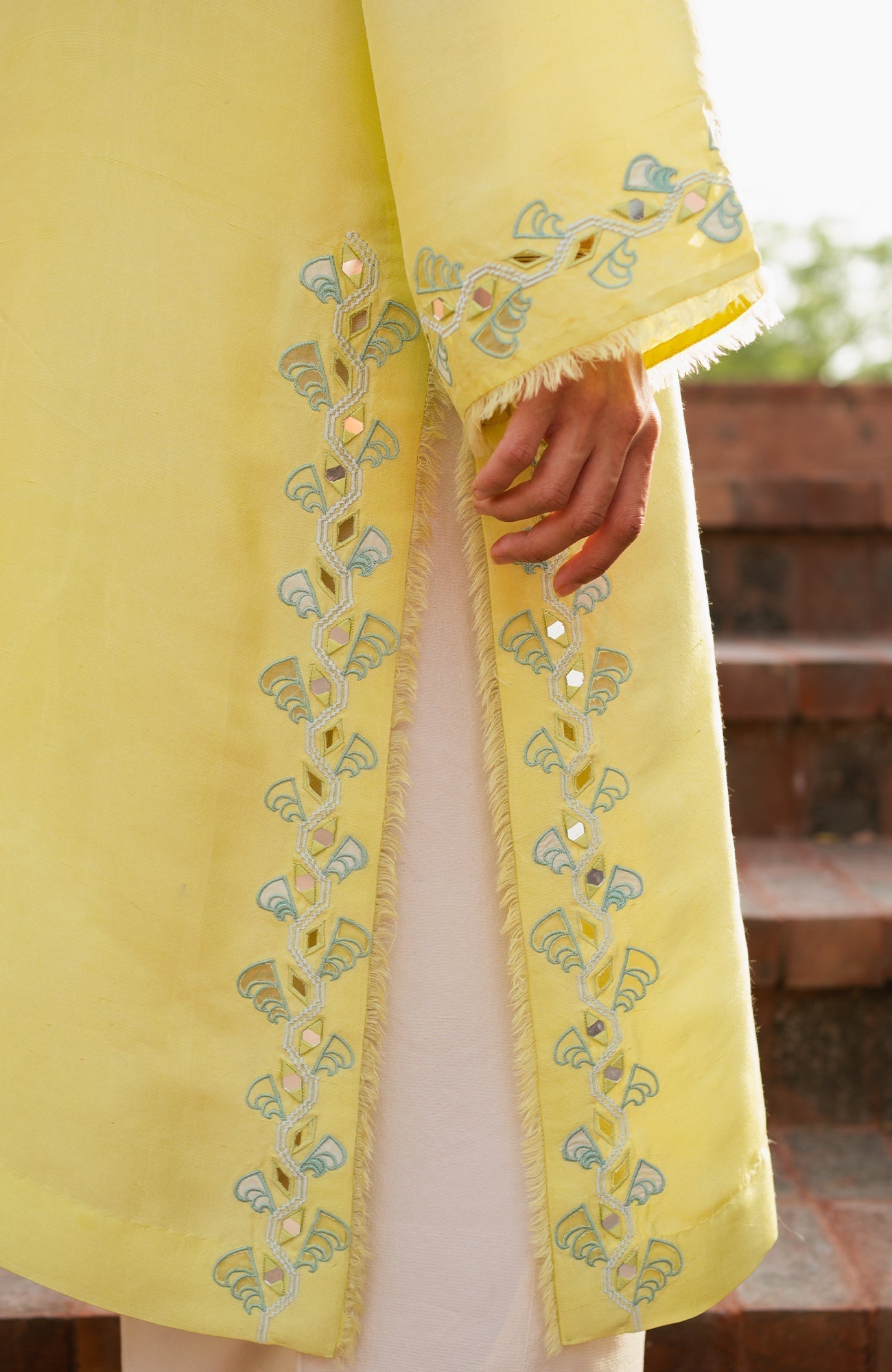 An old school solid lemon kameez features delicately crafted side slits in tonal embroideries and hints of applique and mirror work. Consisting with attractively minimal and chic detailing on the...