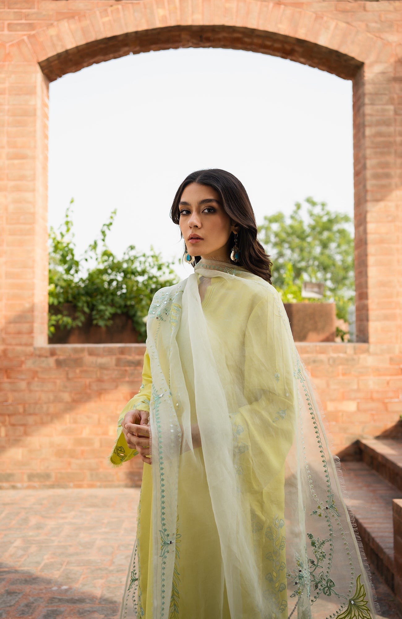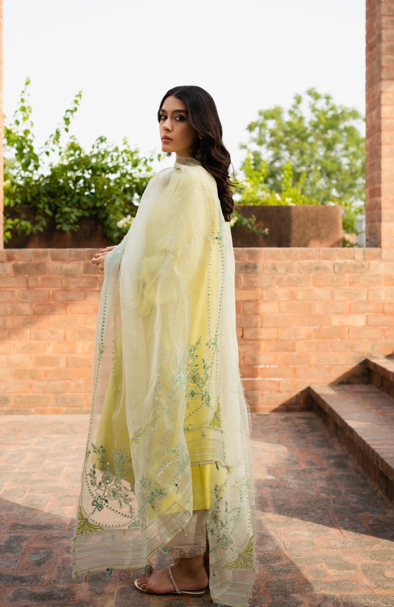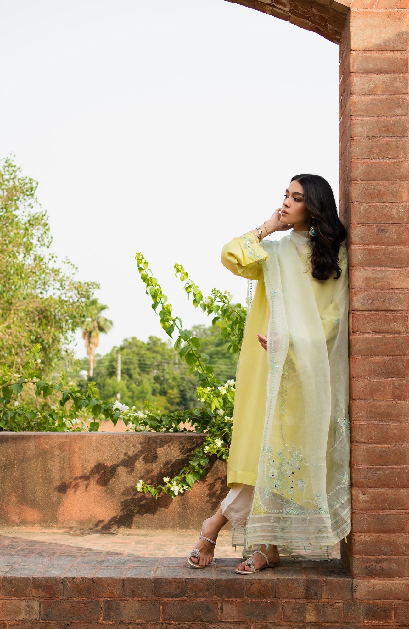 An old school solid lemon kameez features delicately crafted side slits in tonal embroideries and hints of applique and mirror work. Consisting with attractively minimal and chic detailing on the neckline and sleeves. The dupatta is heavily embellished with applique work. The look is completed with our one-of-a-kind organza dupatta that adds a watery soothing tone to Zarah.