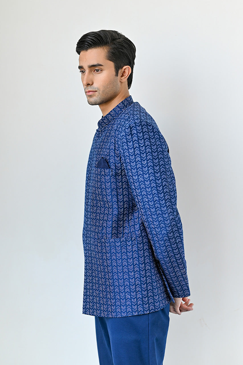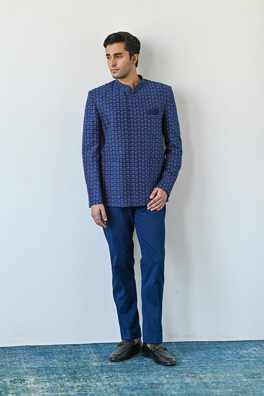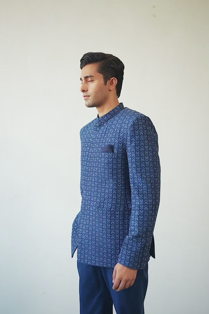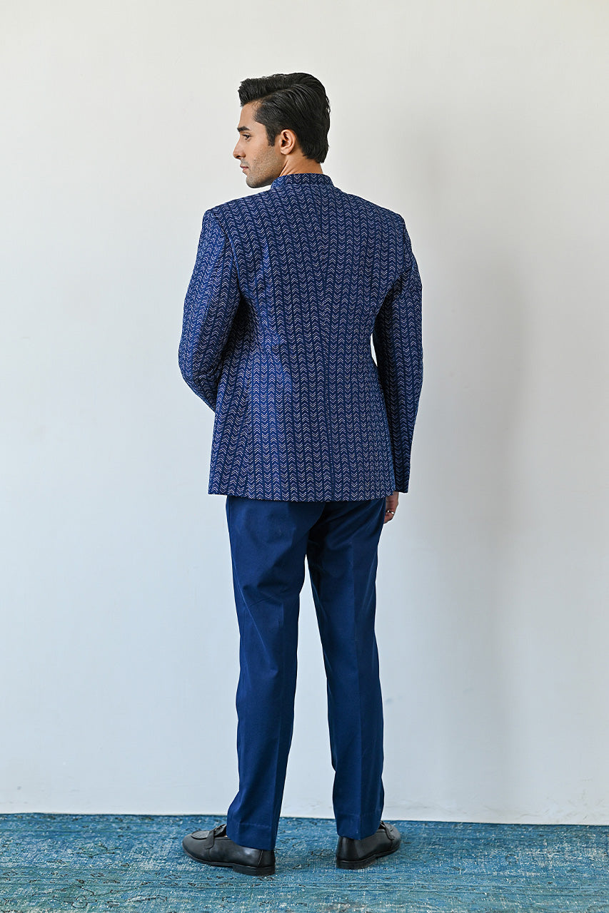 A contemporary take on a classic prince coat, Zayd is a striking cobalt hued pure rawsilk button down prince coat, embroidered with geometric patterns. Lined with the finest medium silk featuring our signature print. The solid coloured pocket square adds a subtle elegance along with matching trousers crafted from the finest wool.Â