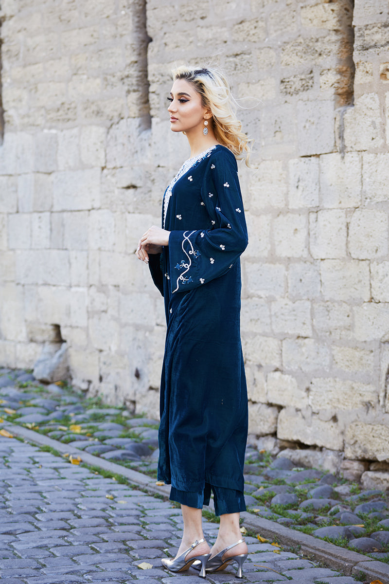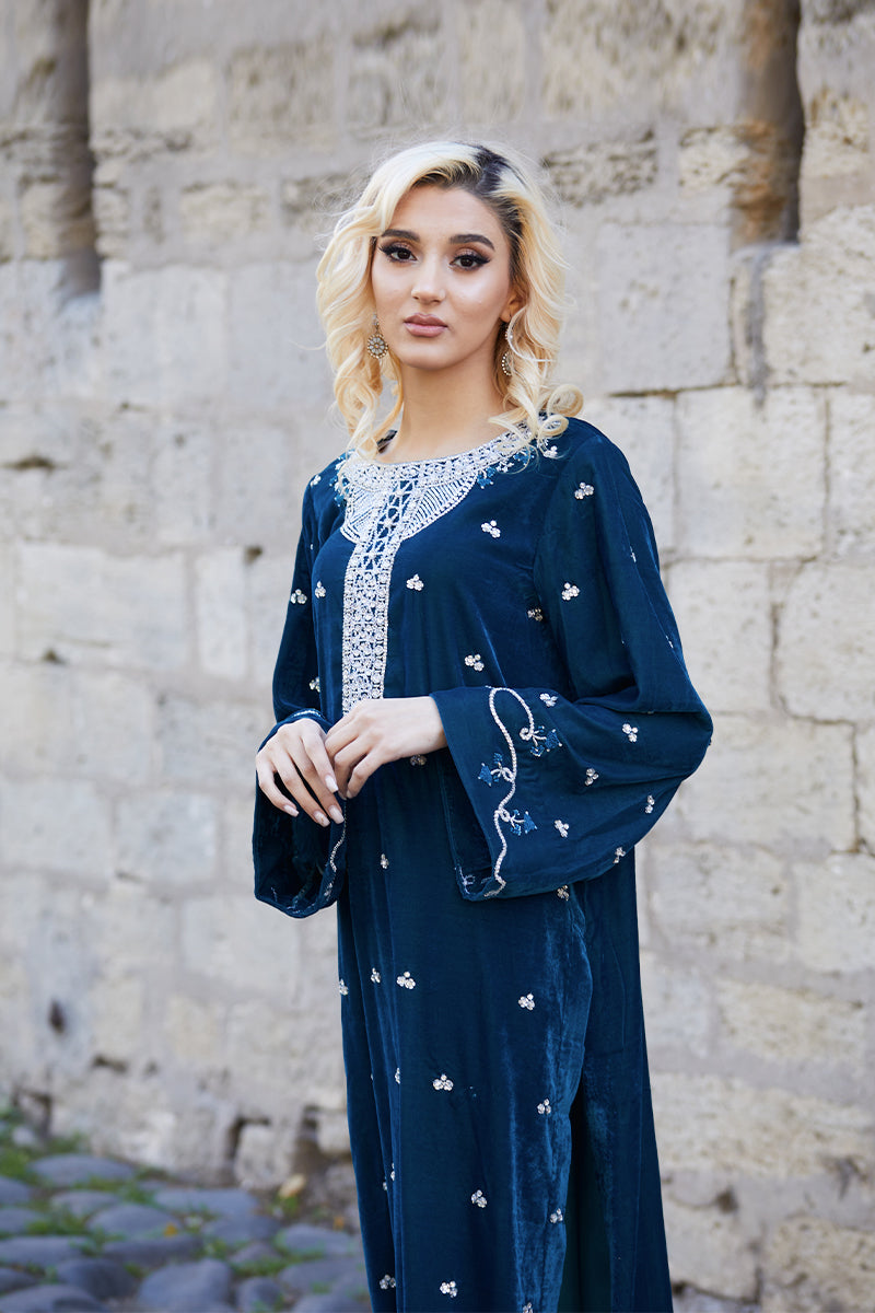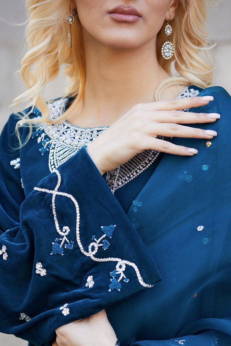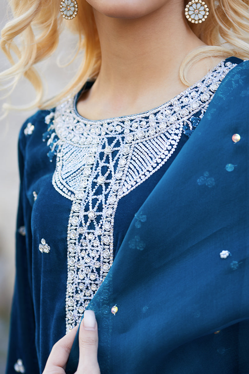 All about fall…this teal shirt is heavily embellished with intricate intricate Swarovski crystals, sabka and resham on neckline. Sequence sprinkled all over the shirt and sleeves creates an impact with...