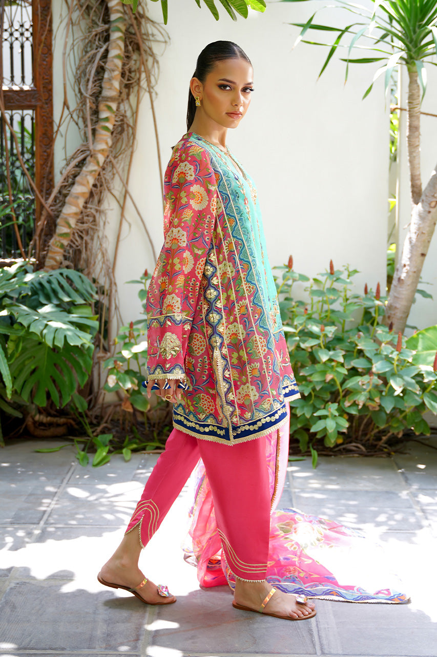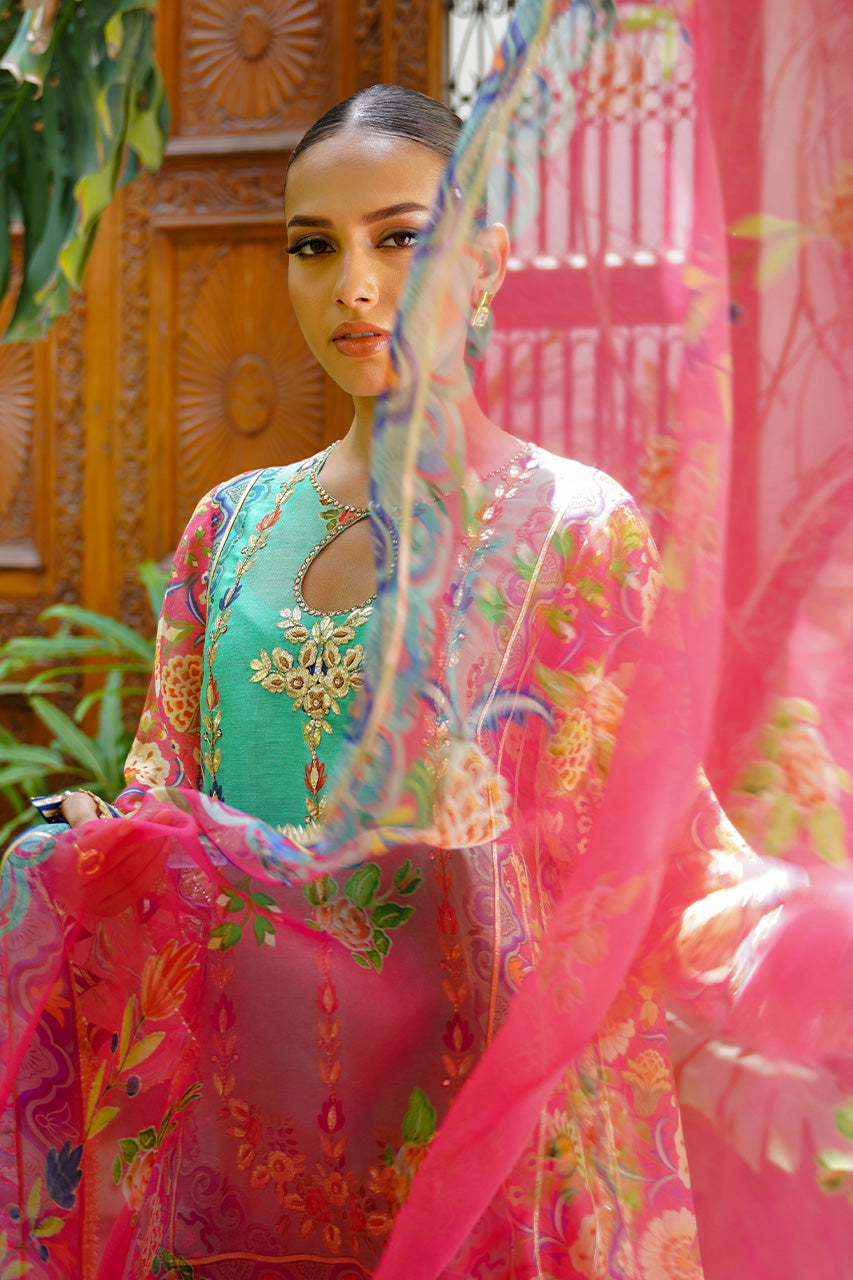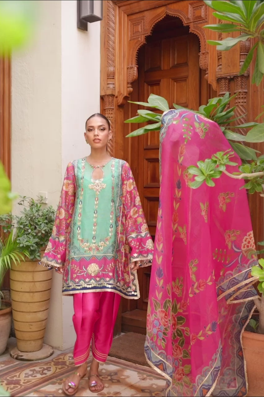 Embrace the vivid allure of mint and salmon pink during crisp fall nights with Zirah (C). The refreshing mint and salmon pink cotton net shirt boasts a classic silhouette and a botanical print adorned with sequin and gota details. The navy blue gota tassels elevate the straight fit sleeves. The painterly salmon pink organza dupatta, edged with gota details, adds a festive flair when paired with pure rawsilk shalwar also featuring gota edging.
