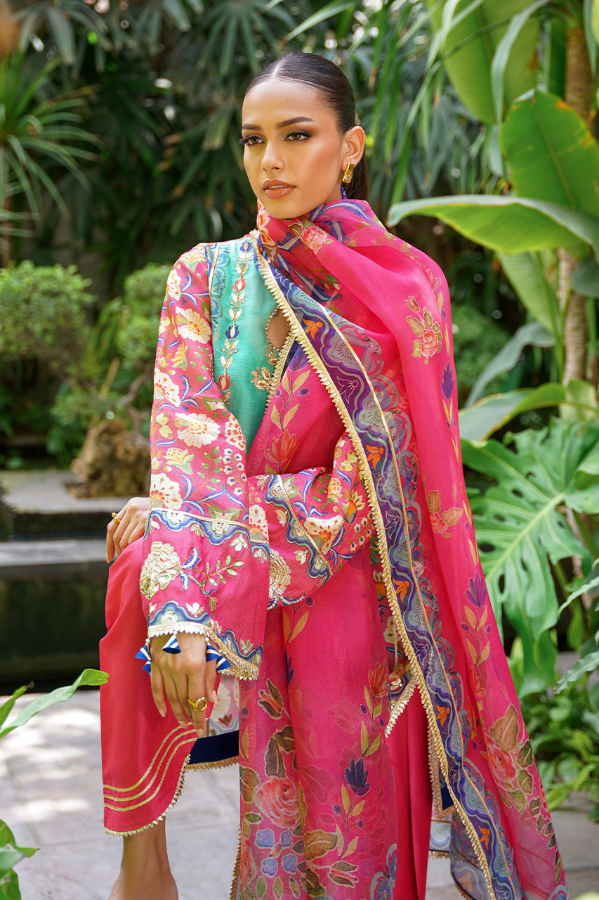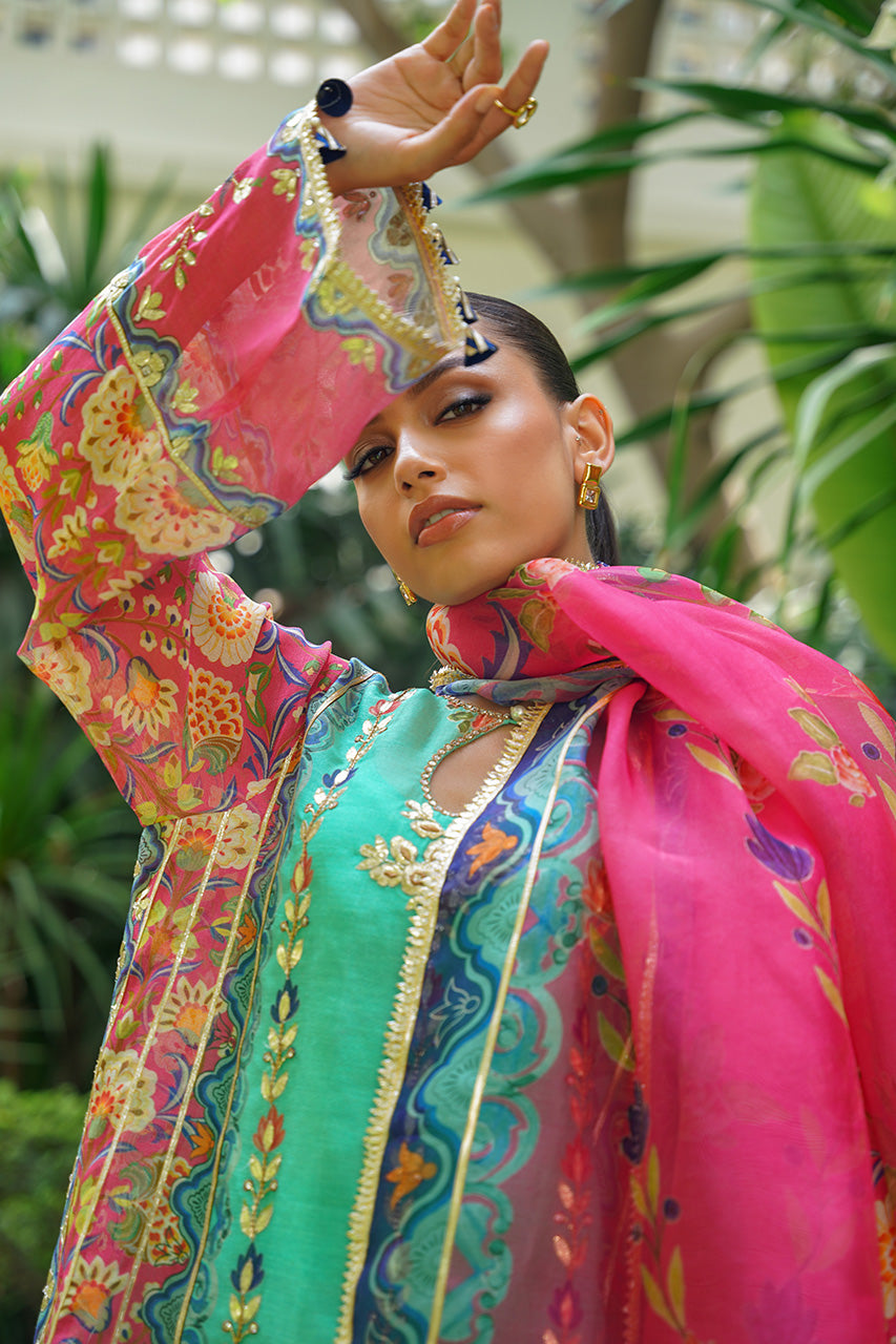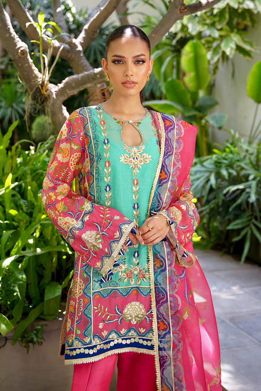 Embrace the vivid allure of mint and salmon pink during crisp fall nights with Zirah (C). The refreshing mint and salmon pink cotton net shirt boasts a classic silhouette and a botanical print adorned with sequin and gota details. The navy blue gota tassels elevate the straight fit sleeves. The painterly salmon pink organza dupatta, edged with gota details, adds a festive flair when paired with pure rawsilk shalwar also featuring gota edging.