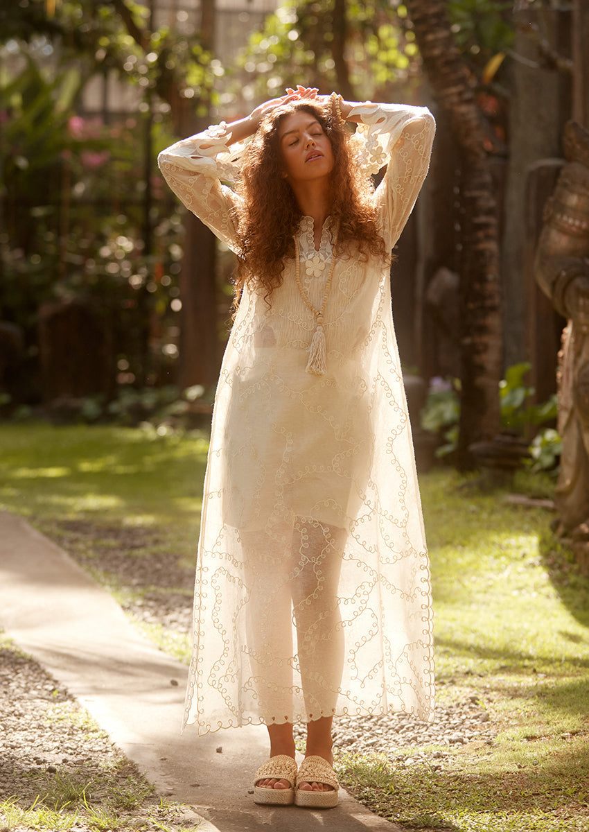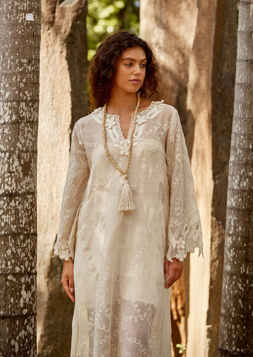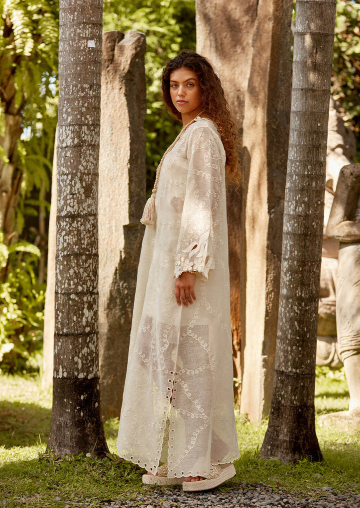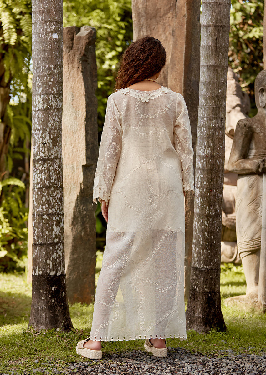 A dreamy, ivory hued kaftan to add a touch of whimsy in your wardrobe. This khaddi corduroy, sheer kaftan is a mystical mesh of tonal embroidery, scalloped edges, and statement eyelet and applique details with 3D flowers. A split crew neckline and scalloped sleeves are a stunning testament to our expert artisans who have stitched magic into this timeless piece.