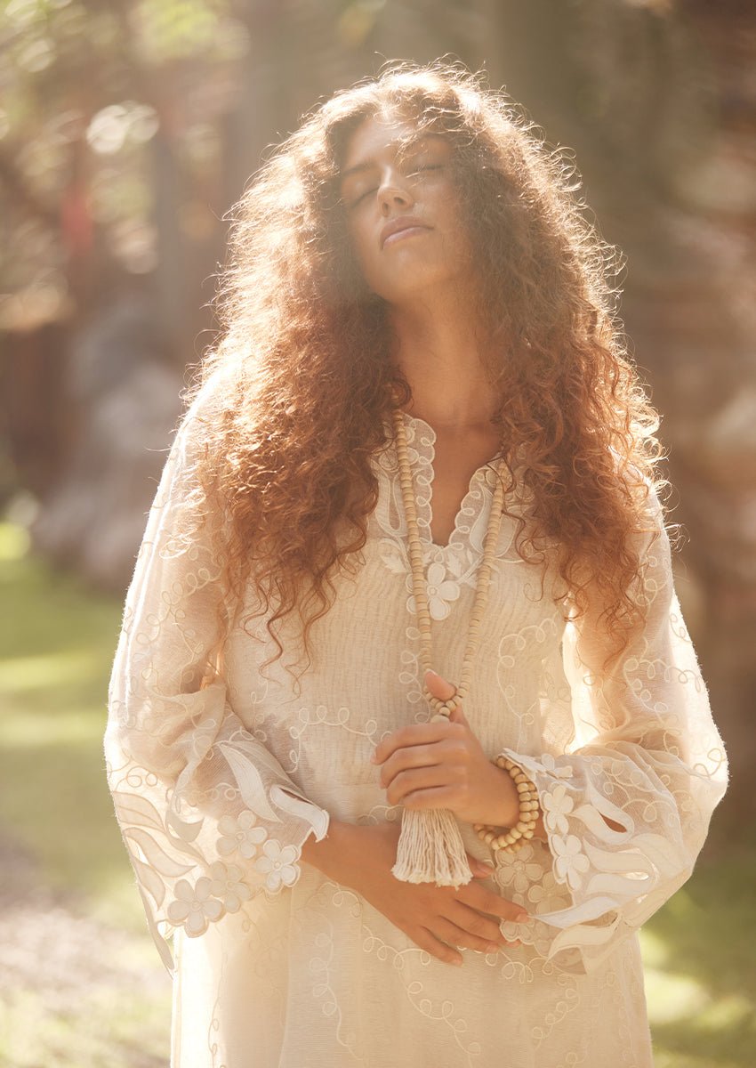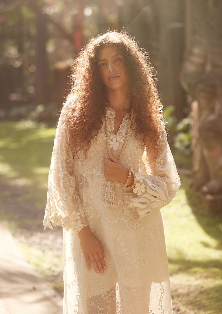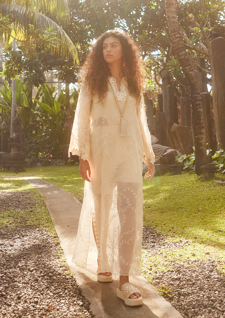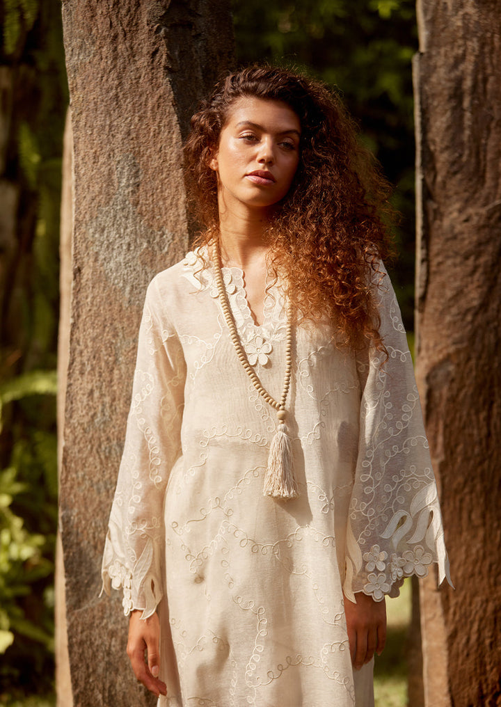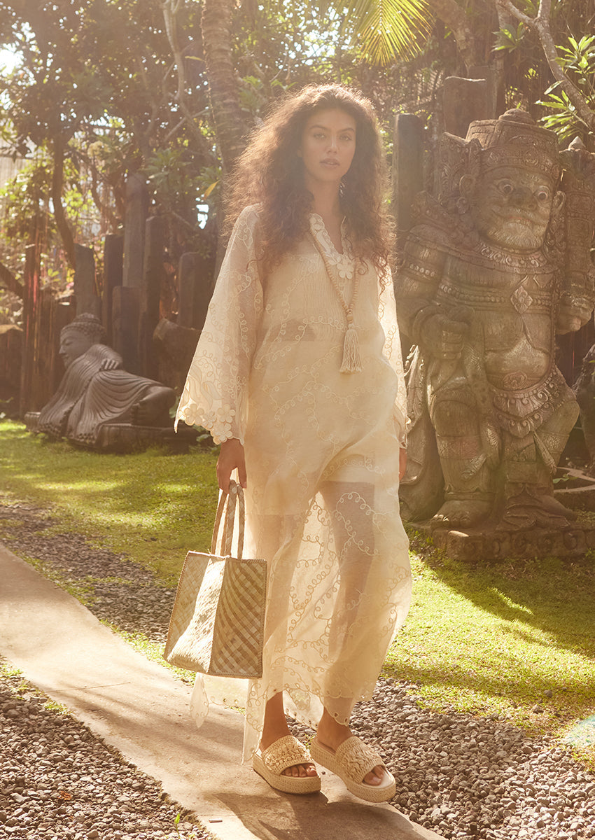 A dreamy, ivory hued kaftan to add a touch of whimsy in your wardrobe. This khaddi corduroy, sheer kaftan is a mystical mesh of tonal embroidery, scalloped edges, and statement eyelet and applique details with 3D flowers. A split crew neckline and scalloped sleeves are a stunning testament to our expert artisans who have stitched magic into this timeless piece.
