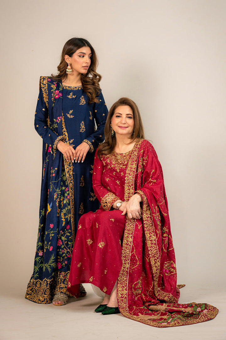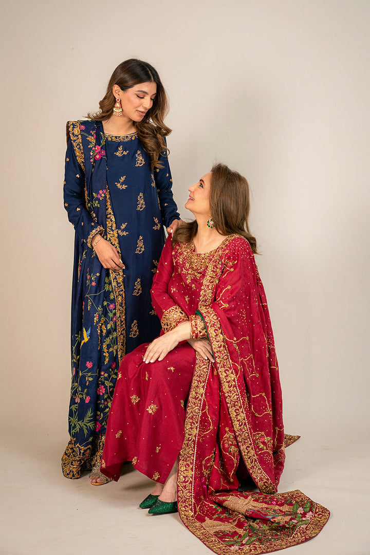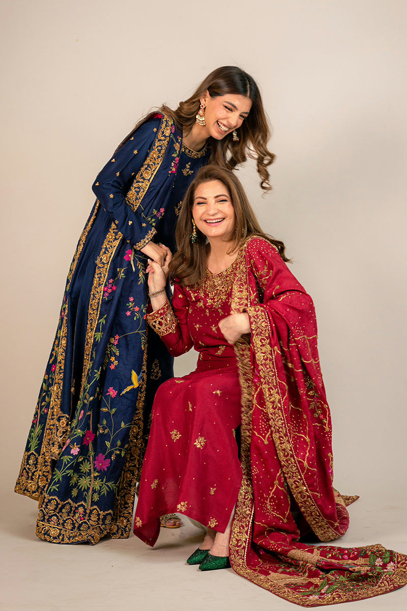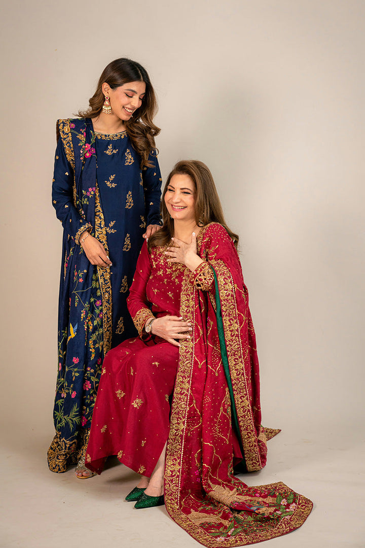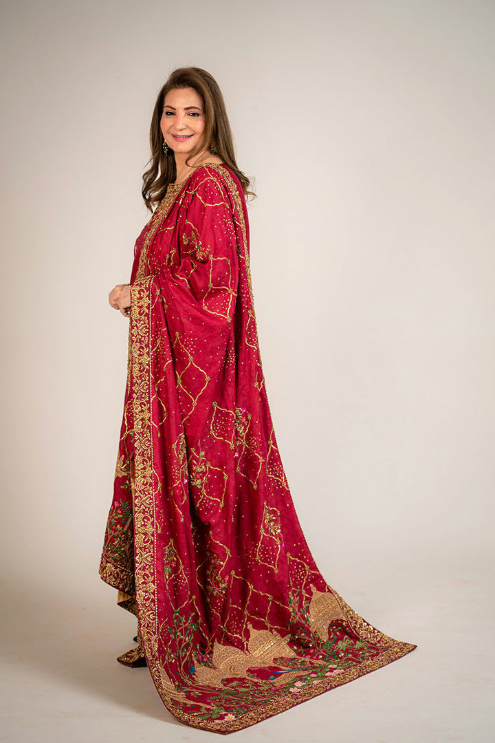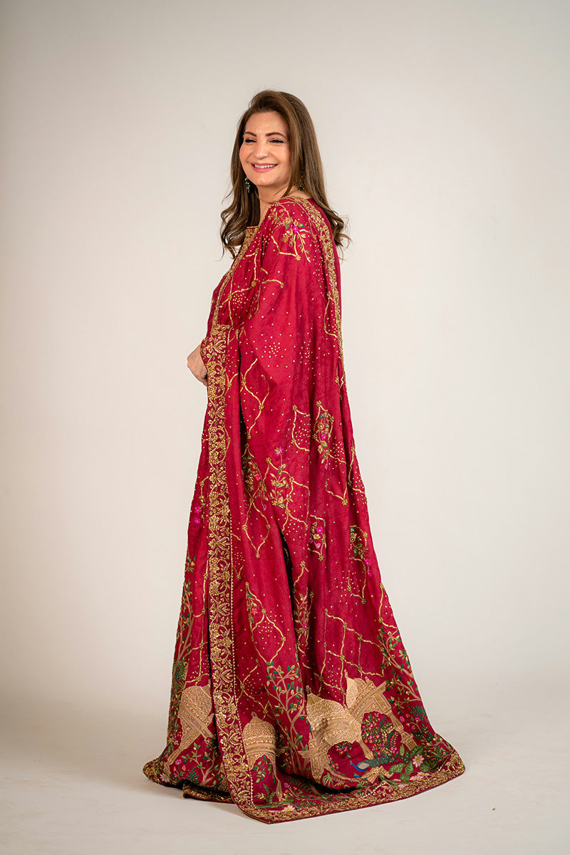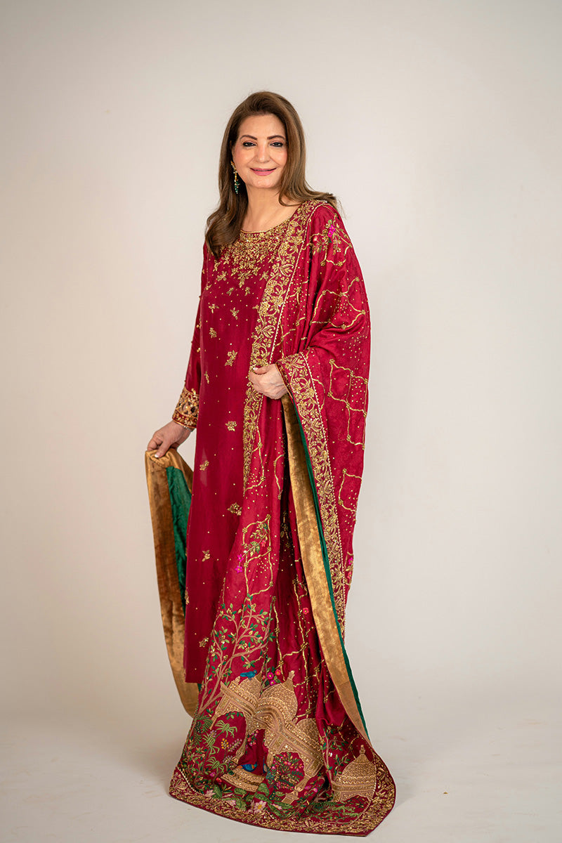Be the most graceful lady in the room. This red straight kurta outfit features delicate hand embroidery which is further brought to life with our stunning red shawl. The shawl features intricate embroideries featuring a garden setting amongst traditional architecture, botanicals and birds.