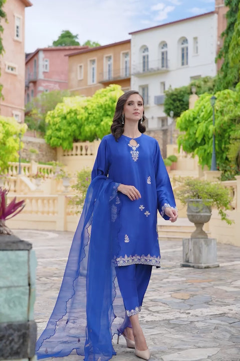 SHIRT: An ink blue, raw silk shirt designed with embroidery on the front and sleeve cuffs; made complete with mirror work detailing. SHALWAR: Raw silk shalwar with embroidery. DUPATTA: Organza...