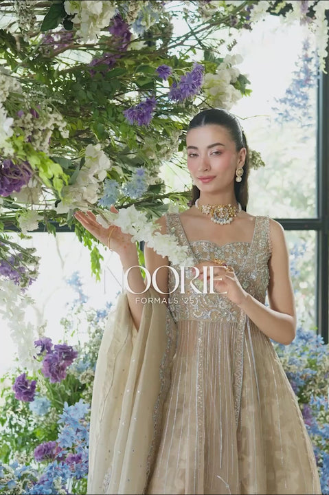 An ethereal ivory ensemble featuring a long sleeveless Katan organza gown, adorned with intricate embroidery on the bodice and along the border for a timelessly regal look. It's paired with a self-printed Lama tissue lehenga that adds subtle texture and richness to the outfit. Completing the look is a matching Katan organza ivory dupatta, lavishly finished with detailed embroidery across the border,creating a harmonious blend of grace and sophistication.