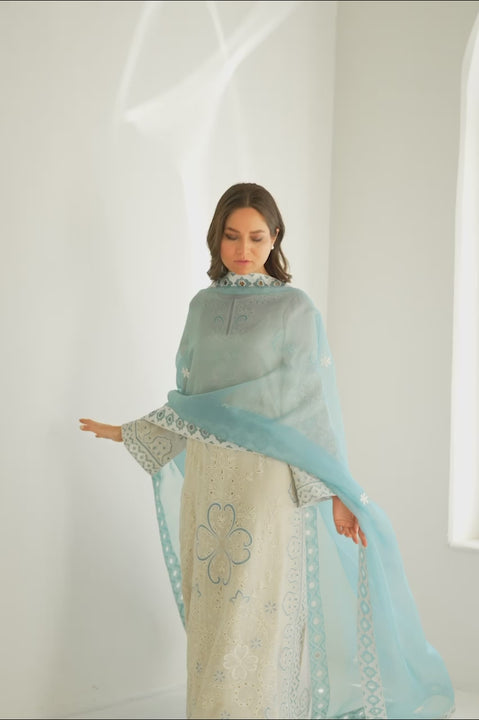 A serene ivory hued khaddi corduroy shirt flows gracefully, adorned with intricate eyelet embroidery and delicate floral patterns. Soft blue appliqué accents lend a subtle contrast. An airy powder blue organza dupatta, framed with embroidered cutwork borders and floral appliqué detailing, drapes effortlessly. Paired with matching pure rawsilk culottes, this ensemble embodies quiet sophistication.